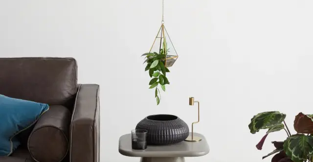 Dans un autre registre, on passe sur un intérieur plus raffiné et plus classe, comme pour une ambiance boho chic avec un pot suspendu en métal doré sublimé par un cordage noir. Simple et design pour apporter une touche de luminosité à vos plantes d'intérieur.