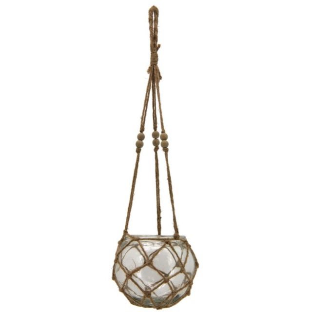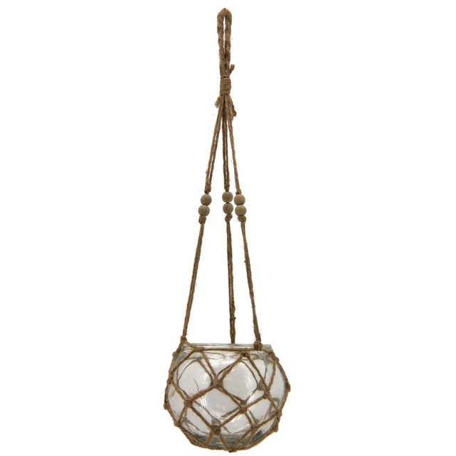 Jusqu'à présent dans cet article je ne vous avais pas encore parlé du macramé alors que c'est une des clefs déco des ambiances bohèmes et on le trouve même parfois dans les intérieur tropicaux. Si vous aimez le vintage, le macramé associé au verre marche très bien aussi. Et ça me fait penser aussi un peu à une déco bord de mer, comme un filet de pêche qui vient suspendre le pot en verre. Enfin, vous l'aurez compris, ce modèle est un passe partout qui sublimera votre décoration!