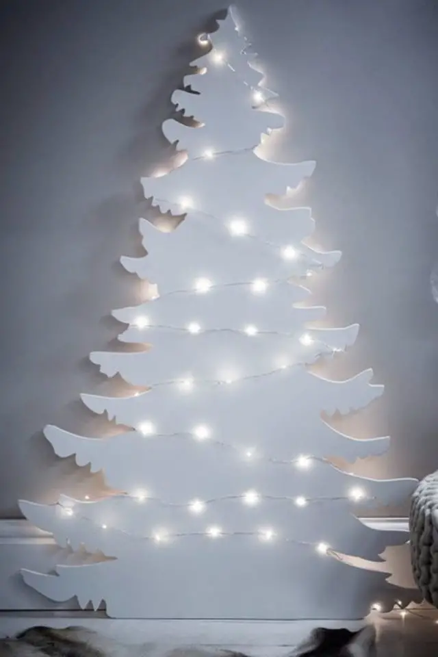 J'aime beaucoup ce DIY parce qu'il est ultra simple et ne demande pas beaucoup de matériel: une guirlande lumineuse assez grande et de la patte à fixe blanche. A l'aide de la patte à fixe, créez la structure du sapin sur votre mur, puis venez coller la guirlande en zigzag. En moins d'une heure, votre sapin sans sapin est installé.