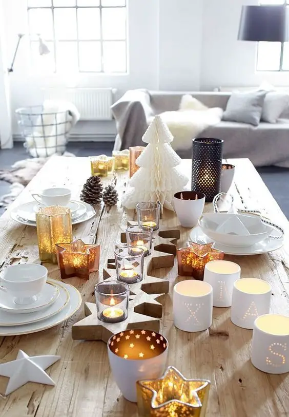 La lumière, c'est festif - Bon j'avoue, dit comme ça, ça ne le fait pas trop. Mais imaginez des bougies, des photophores, des lanternes... C'est totalement chaleureux, un peu comme devrait l'être un bon repas de Noël avec nos proches. Pour une table lumineuse, les couleurs qui vont bien sont le blanc comme la pureté de la neige, mais aussi le vert des plantes pour rester sur quelque chose de naturel. Et si dans votre esprit, une table festive c'est synonyme de faste, on peut même partir sur une déco à base de doré.