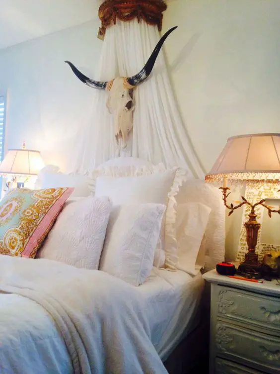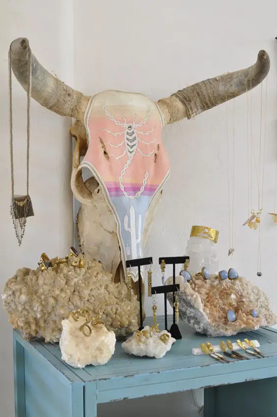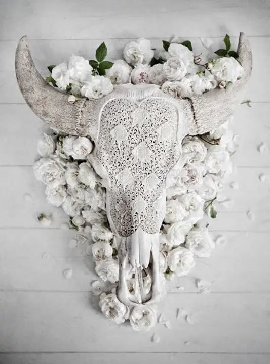 Très souvent, on trouve le crâne de zébu dans des décoration du style bohème. Le zébu / buffle apporte une touche qui rappelle le voyage et l'exotisme mais aussi l'idée de temps révolu - un peu comme un souvenir. On le trouve souvent seul sur un mur. C'est un objet déco assez fort visuellement, inutile de le noyer dans un amas de cadres ou de tableaux. Si vous avez peur qu'il fasse tâche sur votre mur, placez le au dessus d'un meuble bas, comme une console ou une commode. Il existe aussi des modèles gravés, qui rappellent le motif de la dentelle. Un joli contraste entre la symbolique de la bête et la volupté de la dentelle. Le crâne de zébu s'associe très bien avec une guirlande lumineuse par exemple.
