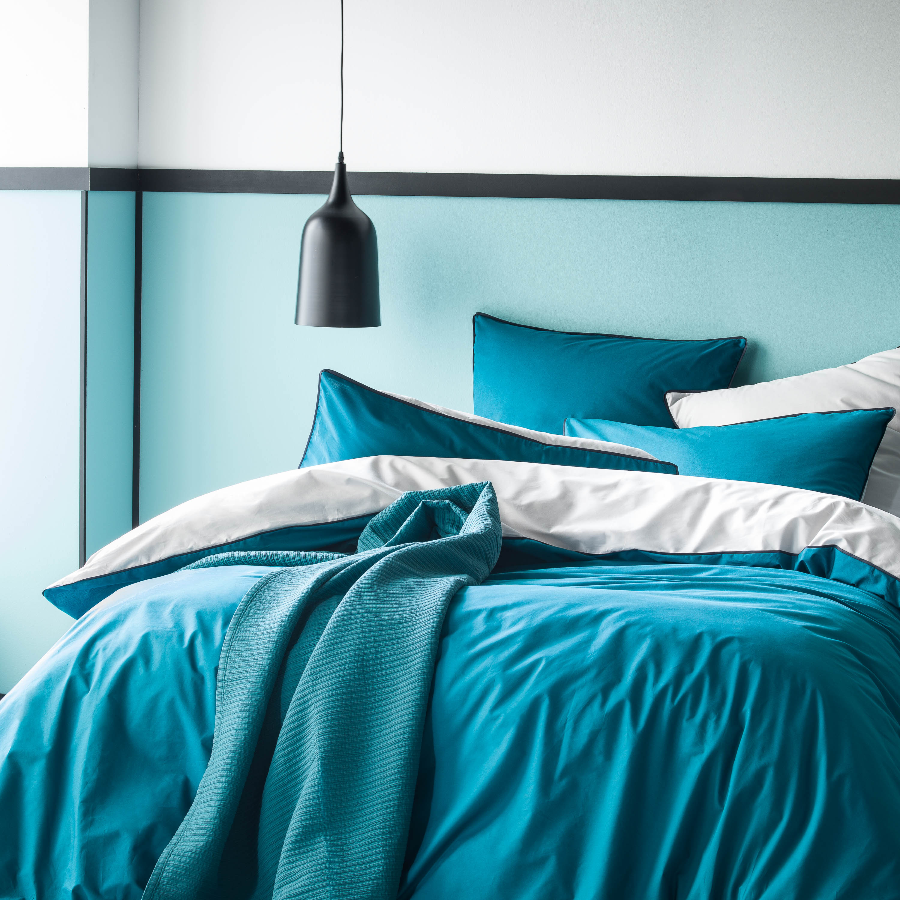 Moins commun, le bleu roi et le rose poudré pour un univers ancien et romantique. On est sur une gamme de couleurs plus intense mais qui n'empêche pas un cadre propice au sommeil. Et de manière plus contemporaine, on peu marier le bleu, le jaune et le corail pour une ambiance pop et dynamique. Le bleu (qu'il soit canard ou pas) avec du blanc et un fin liseré noir crée une ambiance à la Sarah Lavoine, simple, moderne et raffinée.