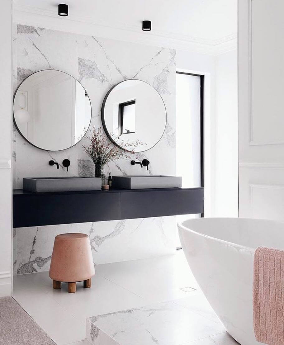 Il a aussi sa place dans la salle de bain. Ces dernières semaines, je vous ai souvent écrit que les armoires de toilettes étaient pratiques parce qu'elles offraient du rangement tout en vous permettant d'avoir un miroir. Si vous n'avez pas besoin de rangements en plus dans la salle de bain, dans ce cas, le miroir rond est top. Posé au dessus de votre meuble vasque, il change définitivement des miroirs qu'on trouve généralement dans la salle de bain. La rondeur est souvent associée à la féminité. On n'est pas ici dans une déco girly, mais dans un univers plus raffiné et plus mature.