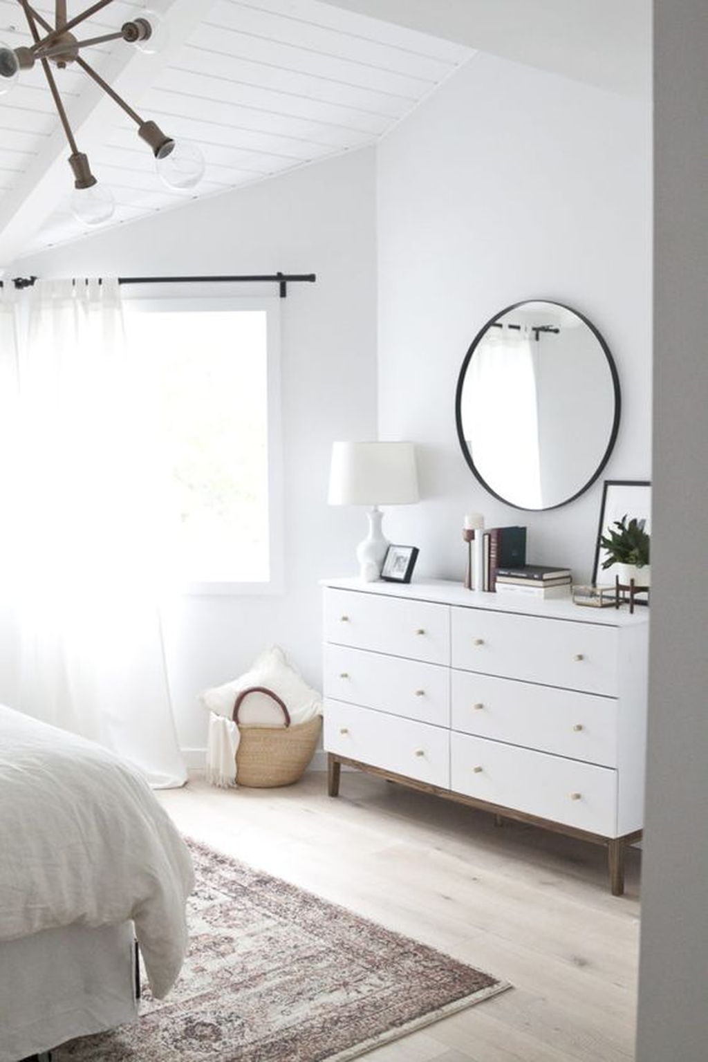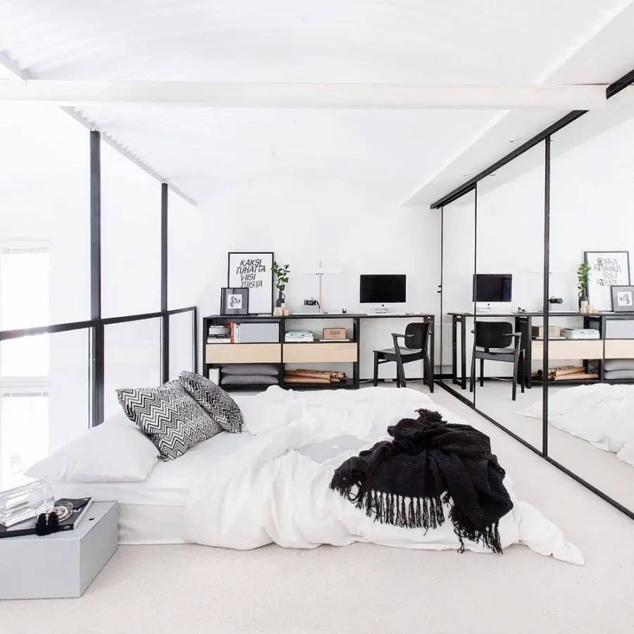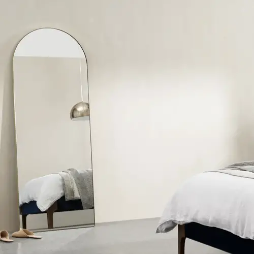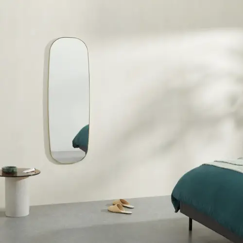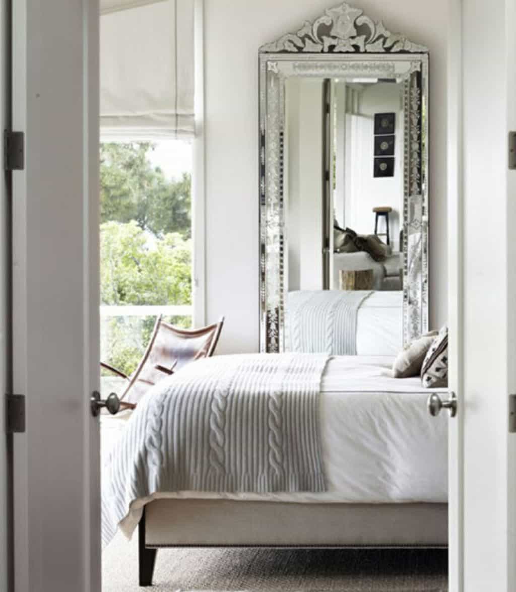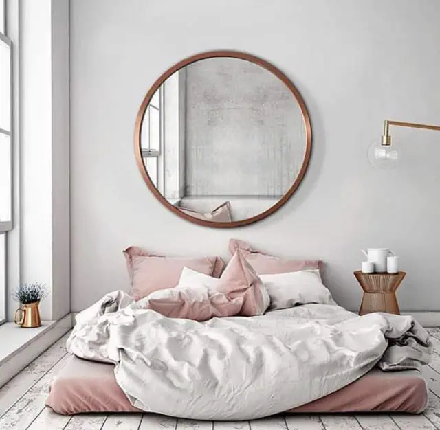 Si vous aimez le style minimaliste dont je parle régulièrement sur le blog, vous n'avez peut-être pas l'utilité de la table de chevet. En revanche, votre lit vous semble un peu vide sans meuble à ses côtés. Pourquoi ne pas partir sur un miroir à la place de la table de chevet. C'est beaucoup moins encombrant et très décoratif!