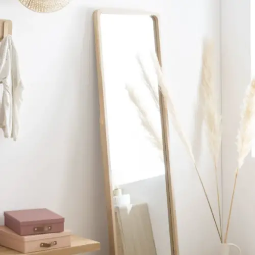La première solution est l'une des plus connue et des plus rapides à mettre en place: Un grand miroir posé au sol. Ce qui est intéressant c'est qu'il vous permet de vous voir entièrement. En revanche, il faut le placer en prenant garde à ne pas encombrer le passage. Si on bute dedans sans faire exprès il pourrait très bien tomber et se briser.