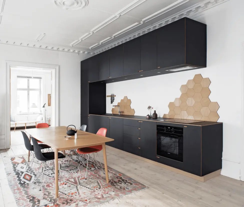 Mais comment éviter cet effet? On l'a vu précédemment, il est possible de passer par le jeu de contraste avec le blanc, il est possible d'atténuer le noir avec le marbre. Mais ce ne sont pas les seules possibilités. Si vous cherchez à créer une ambiance chaleureuse, le bois associé au noir est aussi une combinaison intéressante. Le bois est chaleureux mais aussi lumineux. Une essence de bois clair, comme le bouleau, créera un contraste plus doux que celui du noir et blanc.