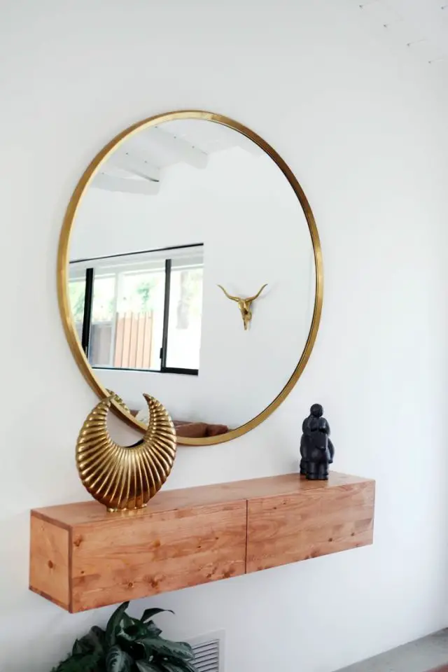 Poser un miroir sur le mur au dessus d'un meuble, que ce soit un meuble à chaussures ou une console, permet d'habiller le dessus du meuble et ne pas avoir un espace qui semble trop vide. Il y a aussi un côté pratique au quotidien, le miroir permet de vérifier son apparence avant de sortir de la maison. En ce moment, la tendance est au miroir rond avec un encadrement épuré. On peut aussi trouver d'une manière plus classique un miroir rectangulaire qui comblera plus l'espace au mur. Si vous optez pour un petit miroir, il peut être associé avec des cadres photos ou encore les plantes grimpantes.