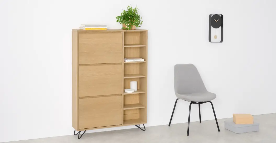 Commençons avec le meuble à chaussures. C'est le meuble le plus attendu dans l'entrée. Et c'est logique! On rentre à la maison, on enlève souvent ses chaussures notamment s'il a plu. Et donc les chaussures restent dans l'entrée. Mais comment choisir son meuble à chaussure? Comme je l'ai écrit un peu plus haut, il est indispensable de choisir un meuble suffisamment grand pour contenir toutes vos paires de chaussures. Il doit aussi être adapté aux différents types de chaussures que vous avez. Si vous avez des chaussures à talons par exemple, il faut pouvoir les ranger aussi facilement qu'une paire de baskets. Si vous avez de très nombreuses paires de chaussures, il est préférable de choisir un meuble à abattant qui vous fera gagner de la place. Il est aussi intéressant de choisir un meuble avec des portes. Elles vous permettront de dissimuler toutes les chaussures et donc créer un ensemble plus épuré. Si vous avez déjà un mode de vie minimaliste, pas besoin de vous encombrer d'un grand meuble à chaussures. Parfois un petit meuble à étagère suffit pour ranger toutes les chaussures. (Avec Flo par exemple, on a 3 paires chacun uniquement dont une paire de tongs...)