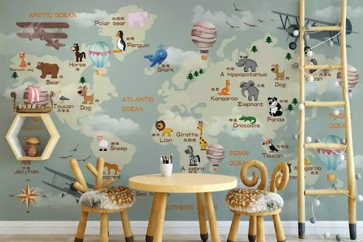Plus contemporain, on a le papier peint qui invite au voyage. Cette thématique n'est pas exclusivement réservée aux adultes, les enfants aussi ont le droit de découvrir le monde. J'aime bien ce type de papier peint parce qu'il éveille la curiosité de l'enfant et lui donne envie de découvrir ce qui l'entoure même si c'est loin. C'est ludique et vraiment sympa.