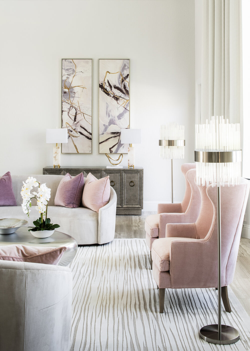 Plus accessible en apparence, on a la lumière. Je précise en apparence parce que c'est facile d'acheter des lampes c'est moins aisé de savoir créer une ambiance lumineuse agréable et chaleureuse. Je l'ai écrit plus haut, les décors Modern Glam sont essentiellement blancs, même si le rose et le doré permettent de le réchauffer un peu. Ce qui me plait dans ce style déco c'est qu'il est chaleureux et le luminaires contribuent à cette atmosphère. Ils rendent le blanc bien plus cosy et intime. Si l'utilisation des lampes ne vous fait pas peur, si vous savez réchauffer une pièce grâce à ces accessoires déco, le style Modern Glam est largement à votre portée.