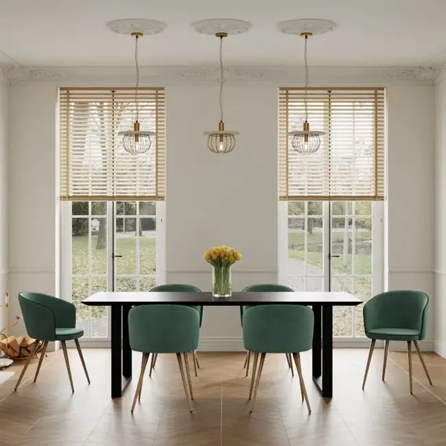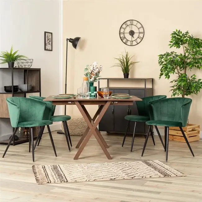 Le vert est la couleur que je préfère. Le velours est un textile que j'aime et que j'ai toujours utilisé dans ma déco. Donc forcément, la chaise en velours vert, c'est à mes yeux le combo parfait. C'est un peu moins solennel que le bleu, un peu moins distant que le noir. Le vert c'est aussi une référence directe à la nature. Si vous aimez les décors de salle à manger naturels et que vous souhaitez tout de même un ensemble raffiné et confortable, la chaise en velours vert est un très bon choix.