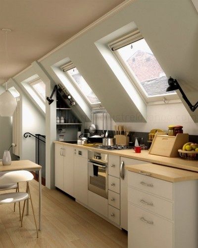 - Une cuisine tout en longueur dans le grenier. Privilégier la fonctionnalité, ce n'est pas l'idéal pour partager les repas en famille, mais vous aurez de la place pour cuisiner.
