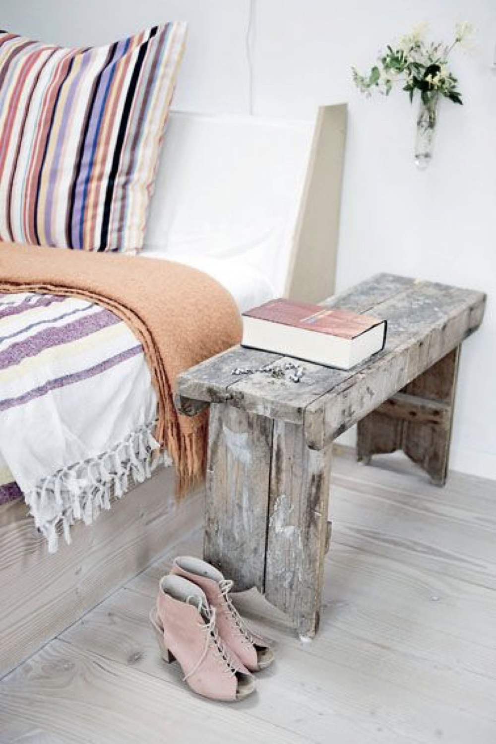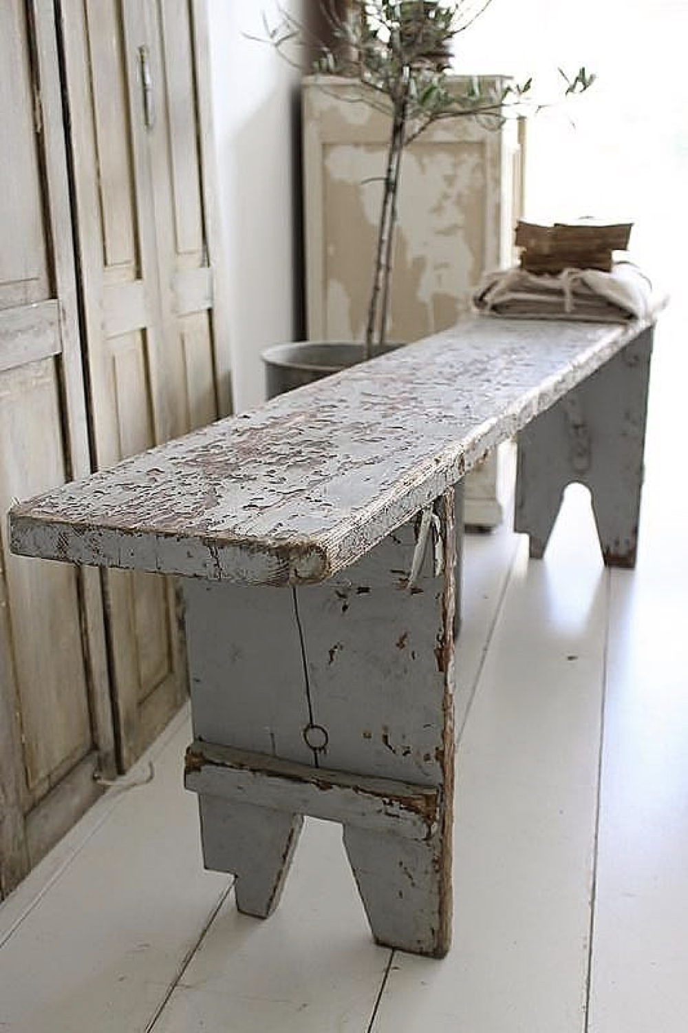 Le banc en décoration peut servir à un tas de choses. Evidemment, il peut être utilisé pour sa fonctionnalité première, c'est à dire s'asseoir. Mais ce n'est pas tout! Le banc peut se transformer en table de chevet, en bout de canapé, en bout de lit ou encore en étagère. Si vous avez de nombreuses plantes d'intérieur, le banc vous permettra de les mettre en hauteur et de jouer sur les différents volumes pour apporter une nouvelle dynamique à votre décoration intérieure. Perso, ce qui me plait, c'est généralement la simplicité relative aux petits meubles d'appoint mais aussi le côté peinture patinée et défraichie qui donne tout de suite beaucoup de caractère à un meuble archi-simple.