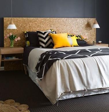 L'OSB est un matériaux qui ne coute pas très cher et qui se travaille assez facilement. Il a aussi un côté brut et naturel intéressant. Et son aspect bois vous permet de créer une décoration de chambre moderne quand il est associé à de la peinture. Pour créer vous même une tête de lit en OSB vous pouvez juste choisir un panneau que vous fixerez au mur ou alors vous pouvez créer un caisson qui vous permettra de poser des cadres et de la décoration au dessus. Cette solution prend un peu plus de place que la première, le caisson créera du volume au niveau du lit. Il peut aussi pourquoi pas être électrifié pour intégrer à votre tête de lit des lampes de chevet.