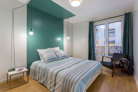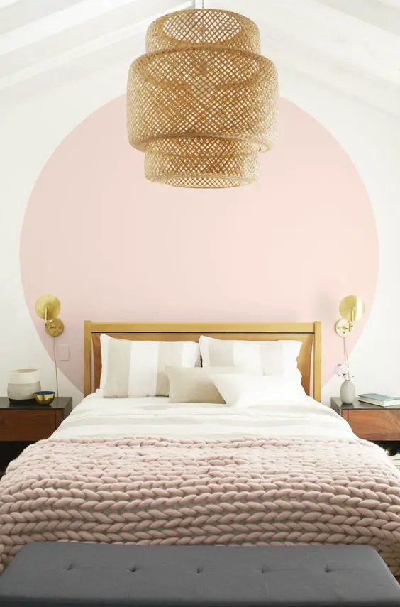 La peinture ce n'est pas forcément en uni et sur tout un mur. On peut en faire presque ce que l'on veut. Et il y a une grande gamme de prix. Il y a évidemment la solution que tout le monde connait, facile et rapide à mettre en oeuvre: le grand rectangle au mur. Mais on peut faire preuve d'un peu plus d'originalité. Comme vous le verrez sur les images ci-dessous, la tête de lit en peinture peut montrer très haut sur le mur pour même déborder sur le plafond. La tête de lit peut aussi être de plusieurs couleurs pour créer un effet graphique et moderne. Et plus tendance encore, vous avez la possibilité de créer un rond de peinture qui fera office de tête de lit. Ce DIY est un peu plus délicat à réaliser, il faut faire preuve de patience pour créer un cercle de peinture propre (le scotch de masquage n'est pas impossible mais le placer correctement vous prendra aussi beaucoup de temps!)