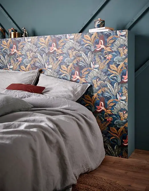La première idée qui vous permettra de créer vous même votre tête de lit même avec un petit budget c'est le papier peint. Vous pouvez le poser à même le mur en prévoyant une réglette de finition pour un résultat impeccable et bien délimité. Il est aussi possible de donner un peu de volume à cette tête de lit en papier peint en utilisant une planche de MDF par exemple ou en réalisant un coffrage. Enfin, une autre solution possible, plus originale, c'est l'utilisation d'un papier peint XXL, panoramique ou fresque pour créer une tête de lit très décorative.