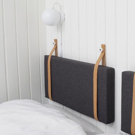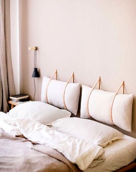Cette solution à réaliser vous même est très cosy et moderne. Elle est aussi relativement facile à mettre en oeuvre. L'élément de base de ce type de tête de lit est le coussin. Il vous en faudra au moins 2 rectangulaires pour un lit 2 places. Et dans l'idéal, il faut choisir un modèle de coussin bien gonflé et de bonne qualité (histoire que votre tête de lit ne devienne pas toute raplapla avec le temps). Il y a plusieurs manière de d'accrocher les coussins au mur pour faire une tête de lit. La première c'est la barre à rideaux qui vous servira à suspendre les lanières de cuir qui tiendront le coussin. La seconde c'est d'accrocher les lanières directement à même le mur.