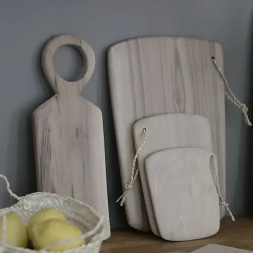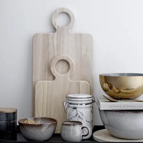 Le bois d'ailleurs se retrouve aussi dans les accessoires de cuisine. La planche à découper est l'un des objets qui symbolise le plus cette ambiance slow dans l'espace de vie. Elle sort du placard pour devenir un objet à la fois fonctionnel et déco. Idem pour les ustensiles de cuisine. On trouve aussi des accessoires en céramique. La vaisselle devient objet de décoration. Elle sort des placards pour trouver une place sur l'étagère et elle est empreint de simplicité. Des formes et des couleurs simples en camaïeux.