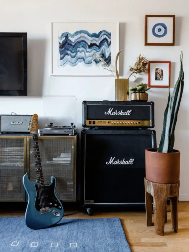 Jusqu'à présent, j'ai parlé de guitare sèche, un peu plus passe-partout que la guitare électrique. Ici ce sont plus les amplis qui vont décorer mais le contrastes en quantité peut-être intéressant à travailler. (Plein d’amplis, une seule guitare). Le mélange des tailles, des modèles et des couleurs d'ampli peut vraiment être sympa à l'oeil, surtout si on aime le maximalisme.