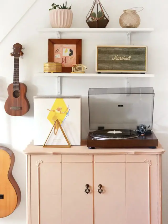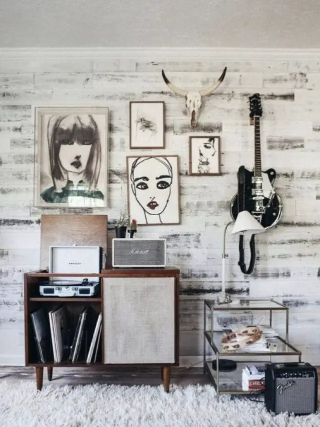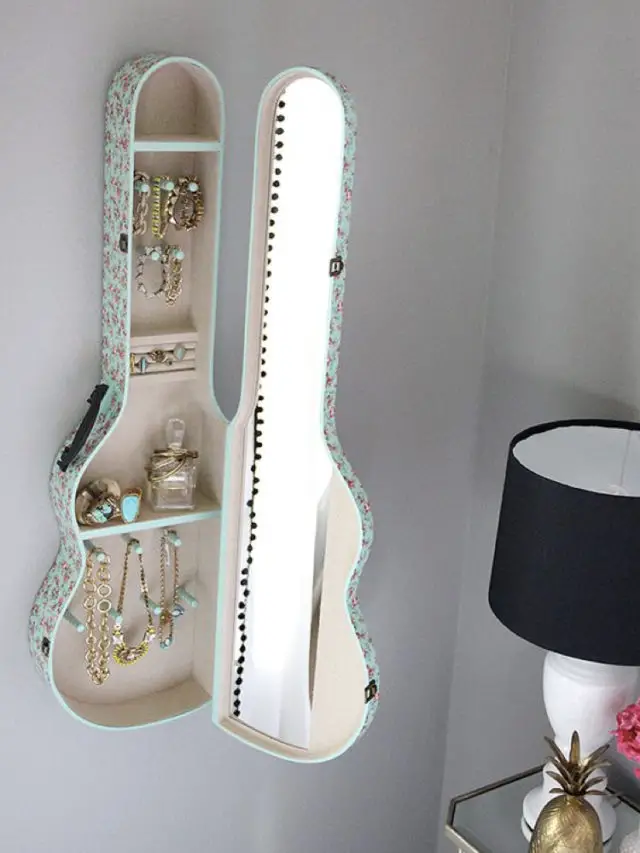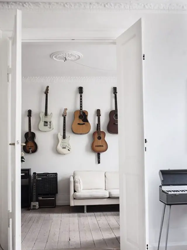 On commence par un grand classique, la guitare. Elle peut être décorative à elle seule mais pas que! Les détournements peuvent être nombreux et très déco. C’est pratique quand on a par exemple une guitare à pas cher qui a un peu vrillé avec le temps. Elle est inutilisable pour faire de la musique mais elle peut être détournée pour décorer.