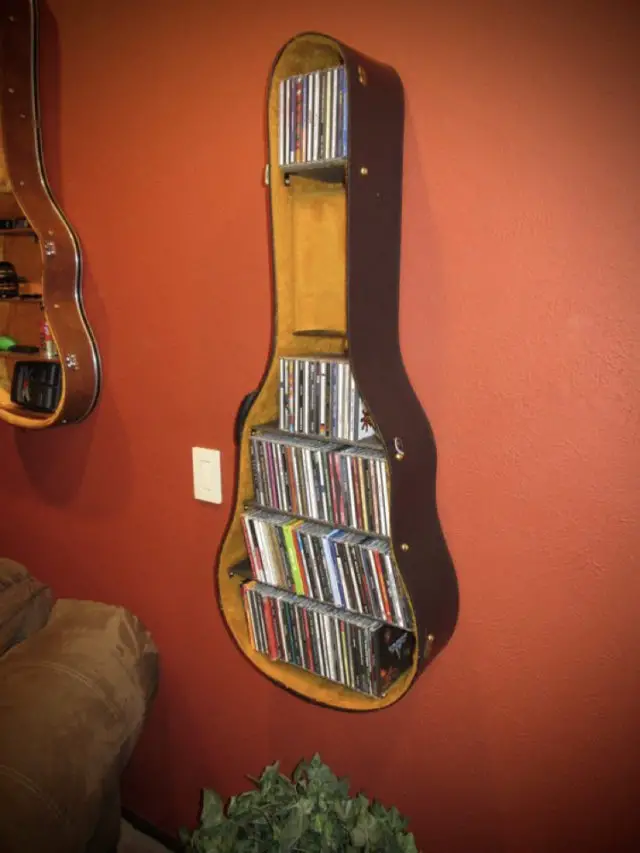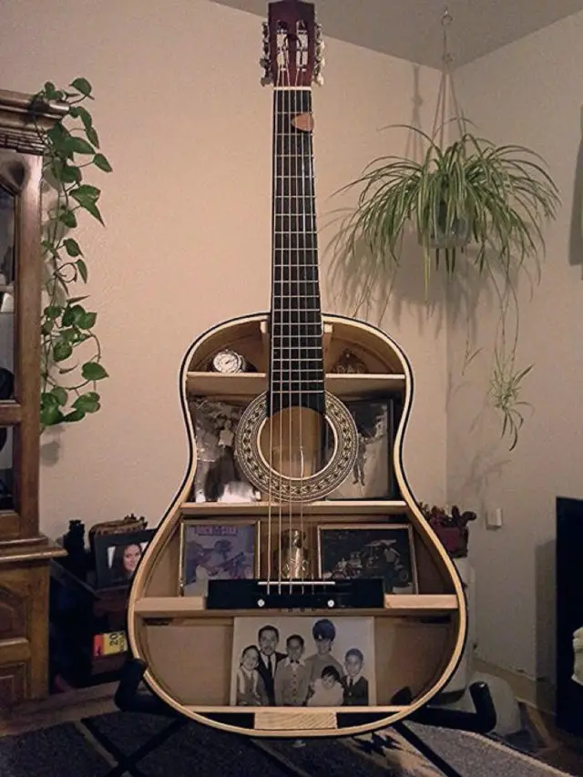 En parlant de détournement de guitare en objet décoratif, il y a la possibilité de retirer l’avant de la guitare et aménager l’intérieur avec quelques étagères fines. Inutile de penser à ranger tous vos dictionnaires dedans, on reste sur quelque chose d’assez fragile. Néanmoins quelques plantes, quelques photos peuvent tout à fait y trouver leur place.