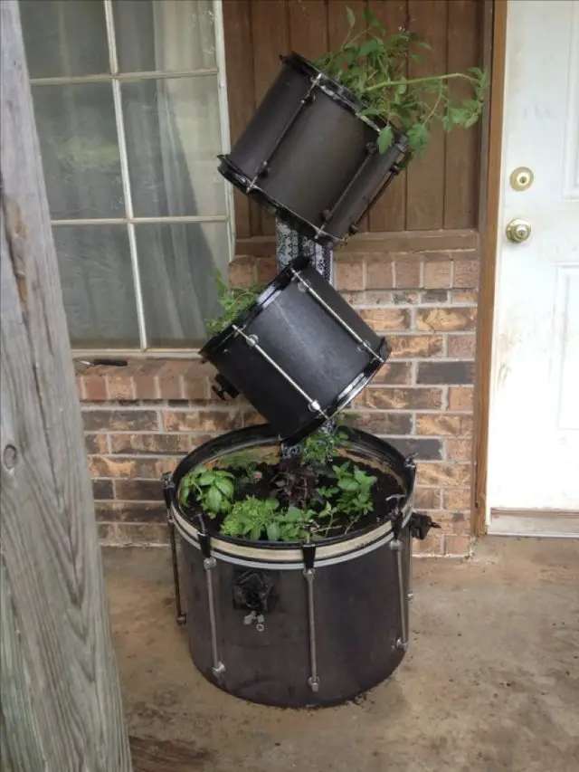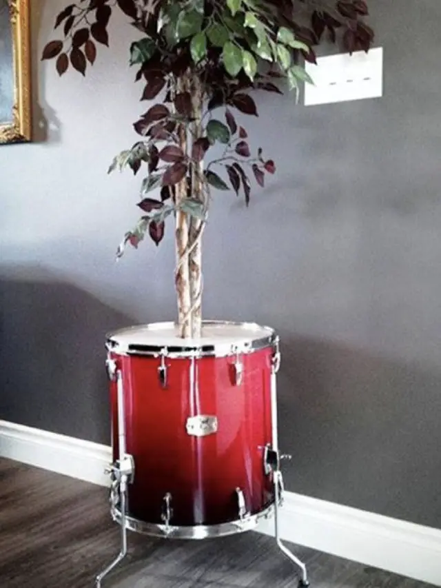 En préparant cet article, je ne savais pas trop à quoi m’attendre. J’avais une petite idée à propos de la guitare ou du piano. J’ai été étonnée de voir autant de batteries détournées, relookées, transformées pour s’inviter dans la décoration. Comme pour la guitare, la batterie se transforme en étagère murale. Mais ce n’est pas tout! On peut la transformer en cache-pot pour une grande plante verte. Il est possible aussi de la transformer en applique murale.