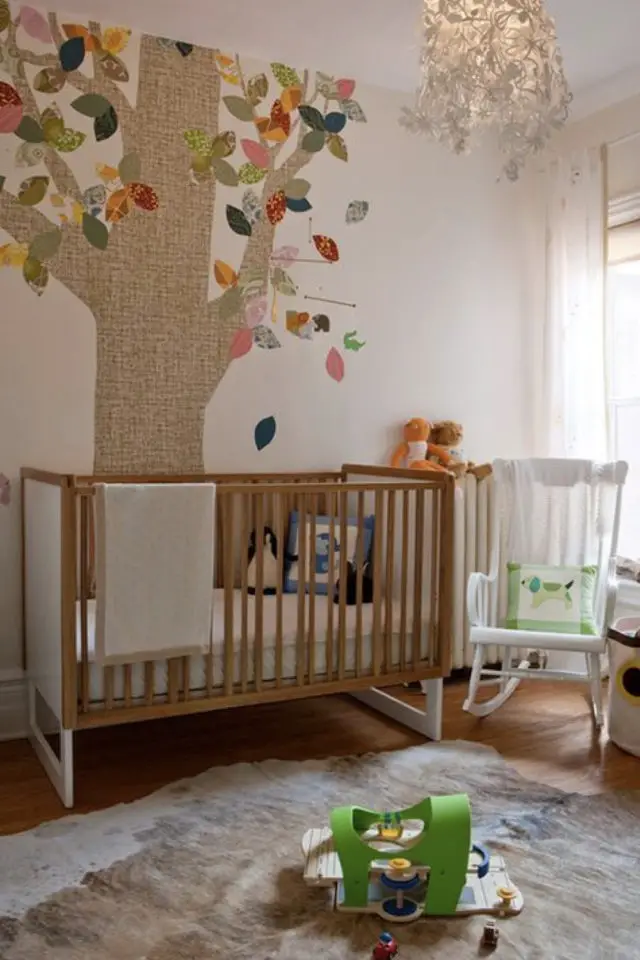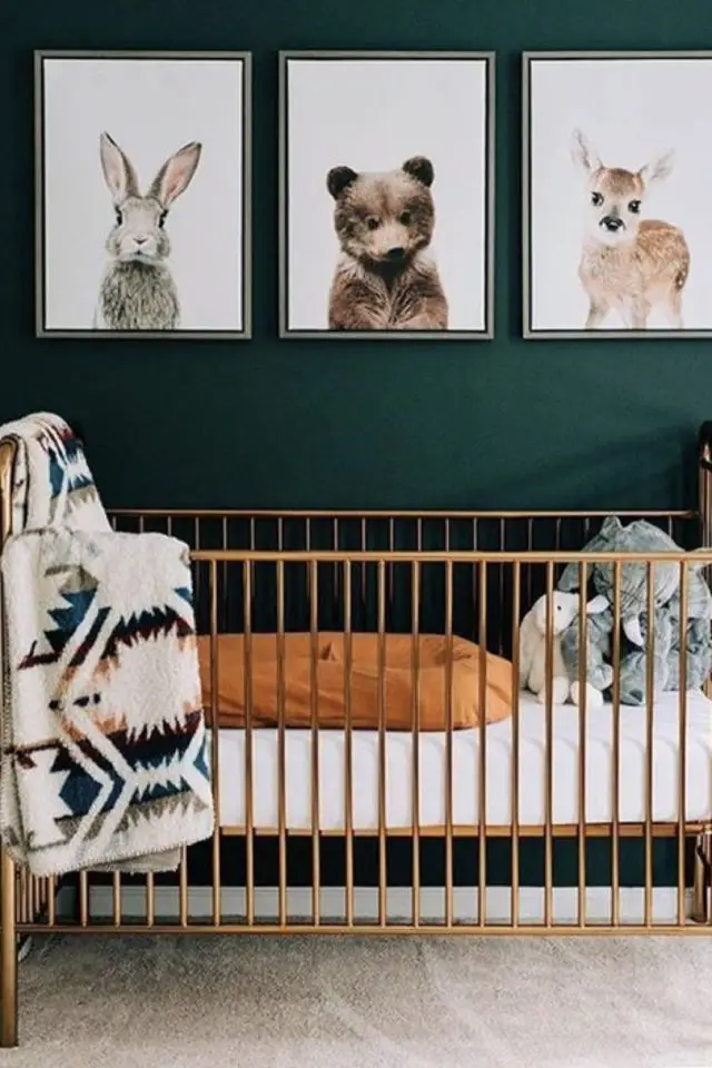 Dernière possibilité: jouer la carte du classique et de la simplicité. Des couleurs douces qui évoquent la nature: des teintes de vert, de beige, de gris. Des matériaux naturel comme le bois, l'osier, le rotin. Et des clins d'oeil à la nature sous toutes ses formes: des arbres, des animaux... C'est probablement le type de décoration la plus neutre de toutes celles présentées dans cet article. Je l'apprécie parce qu'elle est douce et simple. On met le côté ludique un peu de côté pour créer un univers propice au calme, au repos et au sommeil.