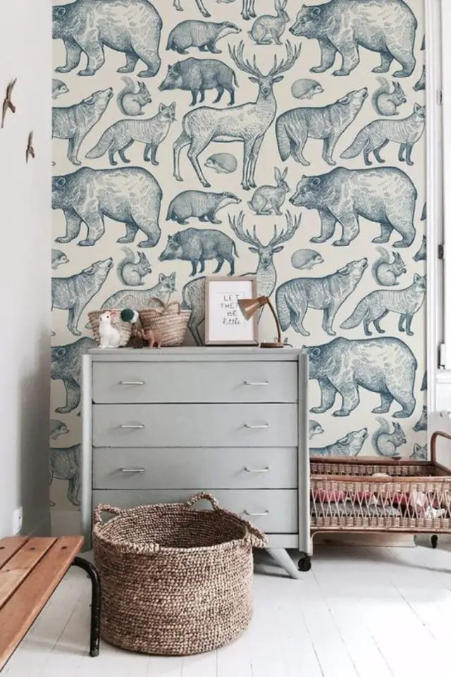 Les animaux pour décorer la chambre peuvent être des animaux de la forêt ou encore ceux de la jungle ou de la savane. D'un côté des ours, des cerfs, des lapins. De l'autres des lions, des girafes, des éléphants. Dans tous les cas, on va retrouver des matériaux naturels, des palettes de couleurs qui rappellent les espaces naturels où les animaux vivent. C'est aussi une porte ouverte sur l'imaginaire... Des contrées inconnues qui laissent place à la rêverie et aux histoires.