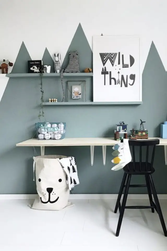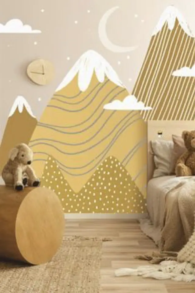 Troisième ambiance possible sur le thème de la nature pour une chambre d'enfant: le paysage. Là aussi il y a des variantes et j'ai un coup de coeur pour les paysages de montagne. Ils sont faciles à simplifier et ils permettent de voyager un peu. Quand on habite en ville ou près de la mer, la montagne est parfois un peu abstrait pour les enfants. On peut opter pour un décor assez géométrique: le montagnes sont ni plus ni moins que des triangles. C'est facile à faire avec du scotch de masquage et de la bonne peinture. On peut aussi faire le choix de mettre un peu plus de détails. Ca prendra un peu plus de temps à réaliser et si vous n'avez aucune compétences en dessin, ça risque d'être compliqué. Cette deuxième solution permet de jouer avec les couleur et peut-être apporter un peu plus de douceur.