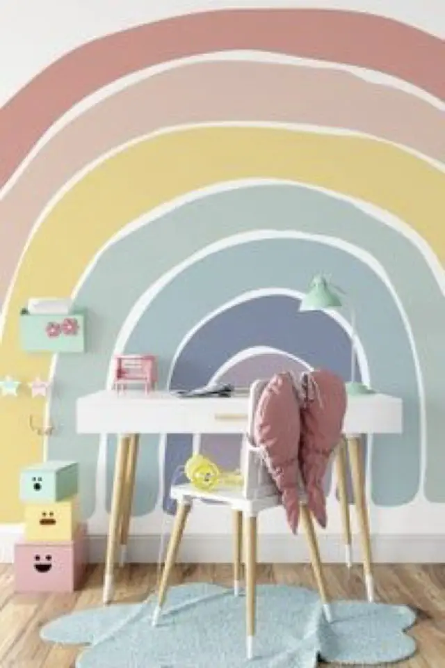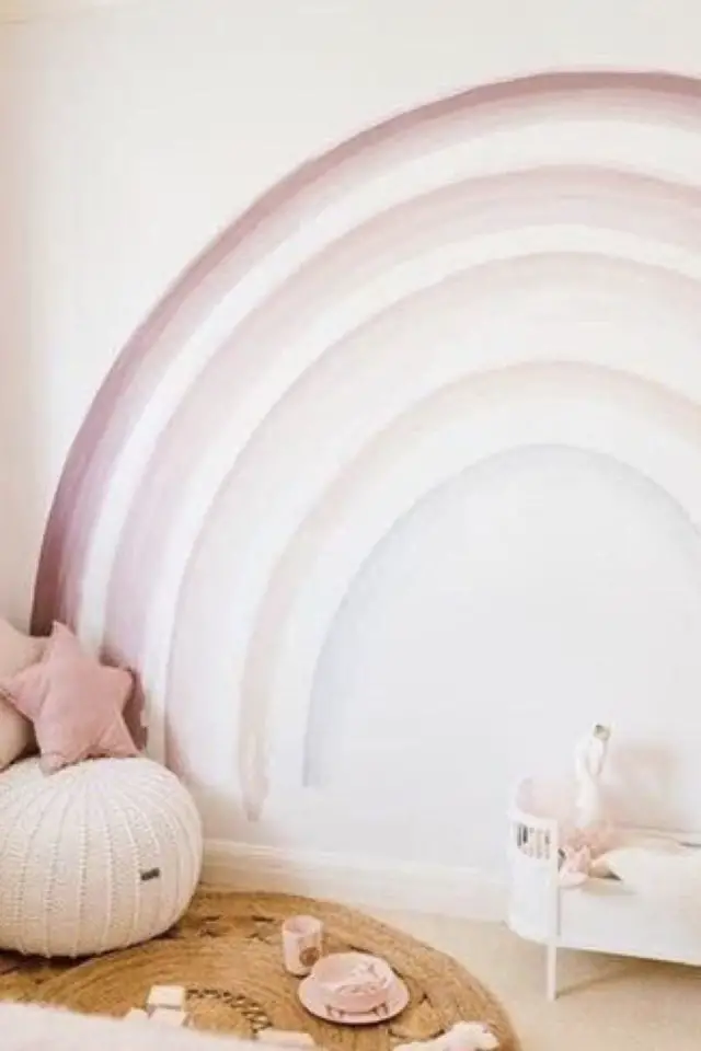 Changement de décor. Si vous souhaitez rester dans le thème du naturel mais sans tomber dans les décors de jungle / forêt pourquoi ne pas opter pour un arc en ciel. C'est un phénomène naturel qui éveille l'imaginaire des petits comme des grands. Il y a toujours quelque chose de magique à voir un arc en ciel. Je trouve aussi qu'il y a une note d'espoir. En plus de cette symbolique, l'arc en ciel permet d'apporter de la couleur dans la chambre de votre enfant, même si on décline une seule couleur de différentes nuances. L'arc en ciel peut prendre différentes formes: un dessin sur le mur (pas besoin d'avoir des compétences de ouf pour le réaliser vous-même. Il peut aussi être présent dans différents éléments de déco comme le tapis. Enfin, on peut revenir sur sa forme: simple et douce parfaite pour la chambre d'enfant.