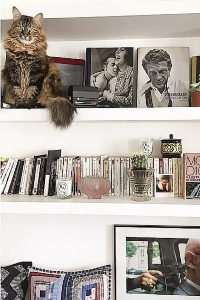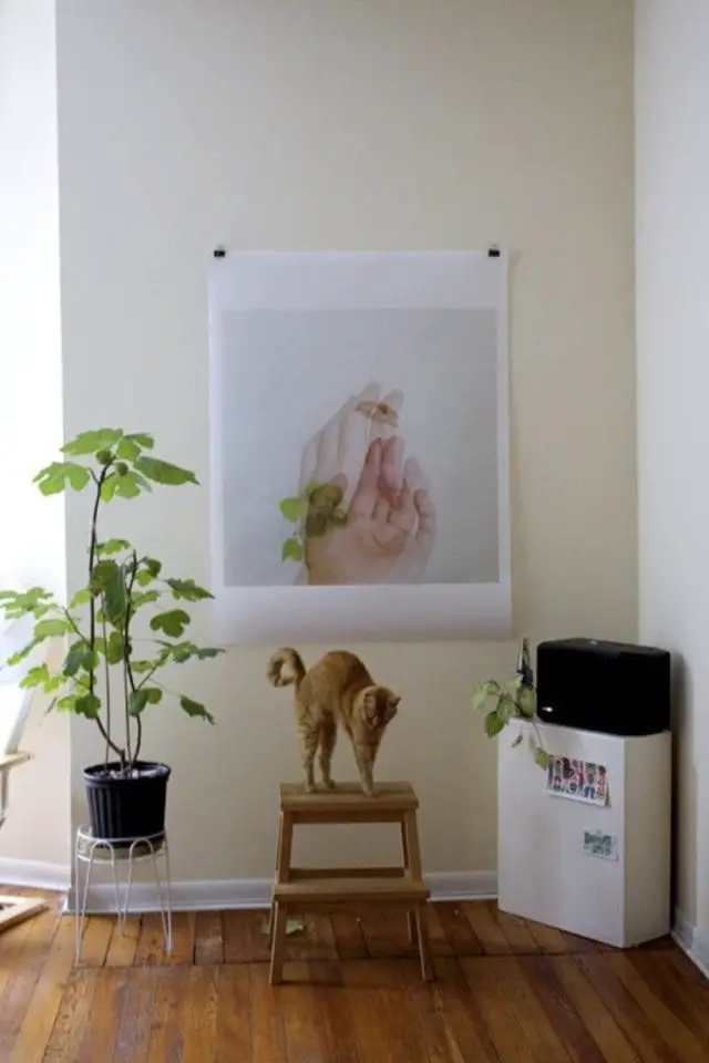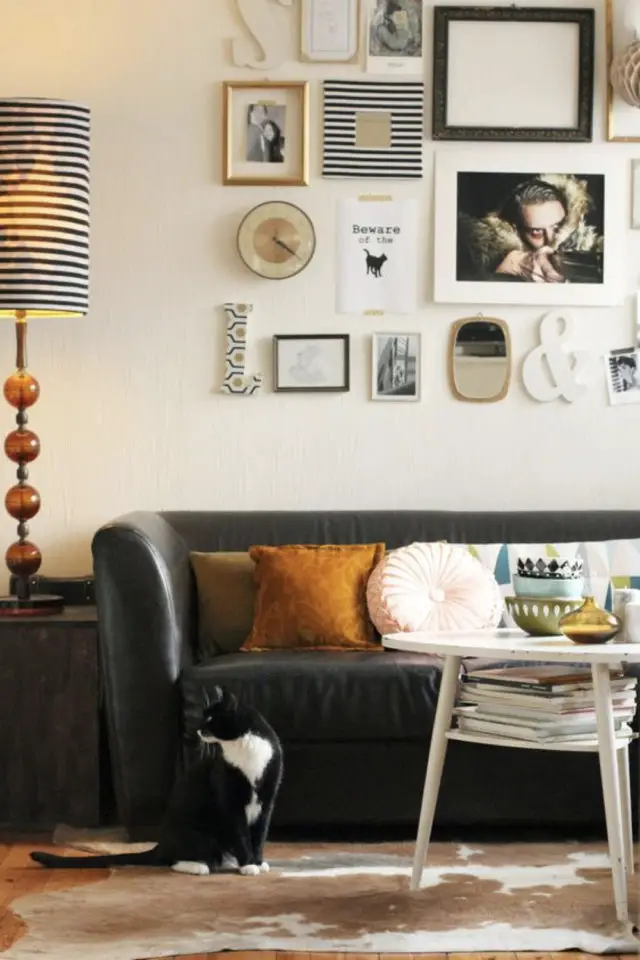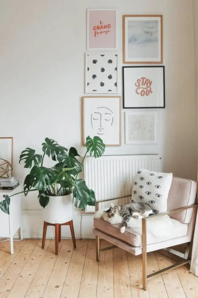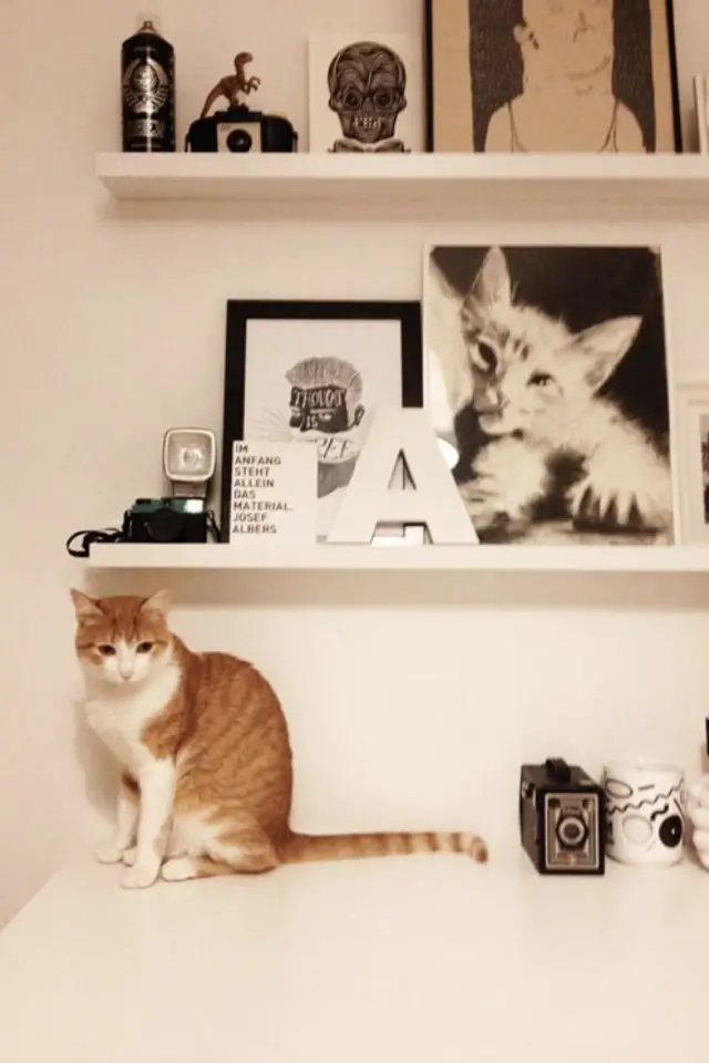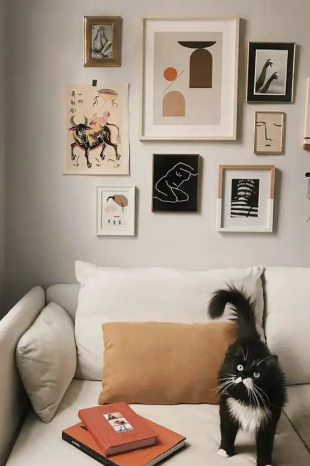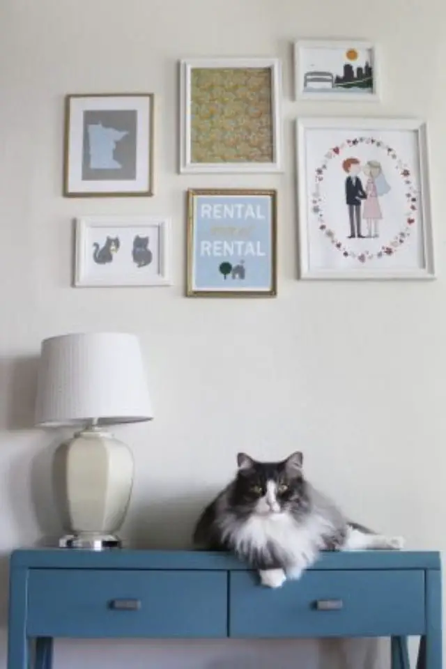 Contrairement aux plantes, aux rideaux, aux écrans d'ordinateur ou encore aux choses qui trainent sur la table, les félins d'intérieur laissent généralement tranquilles les cadres accrochés au mur. On n'est tout de même pas à l'abri d'un coup de folie du chat qui va s'énerver pour une obscure raison contre des cadres à sa portée. Il ne faut pas sous-estimer leur folie incompréhensible. (Allez savoir pourquoi les chats prennent en grippe le rouleau de papier toilette...) Bref, comme le but de cet article est de vous montrer de jolies images de déco et de chats, les cadres c'est parfait! Et en plus, dans quelques jours, je vais vous en reparler.