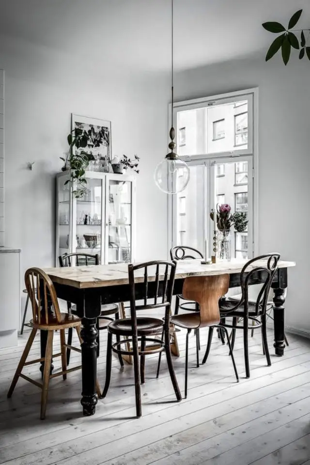 Même si acheter des chaises en lot coûte moins cher que de les acheter à l'unité, on peut tout de même s'amuser avec les chaises autour de la table sans que ça ne vous revienne trop cher. Voilà quelques associations de chaises dépareillées: