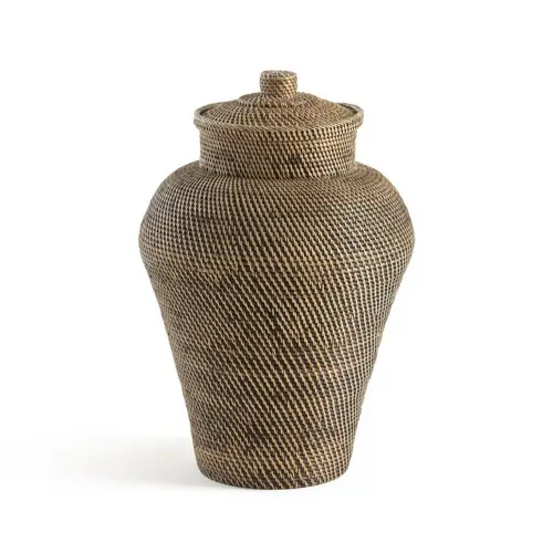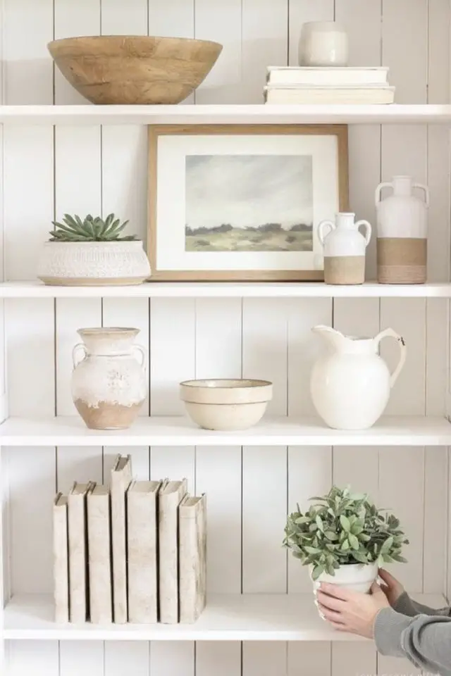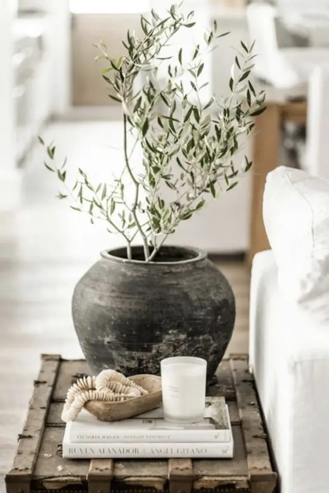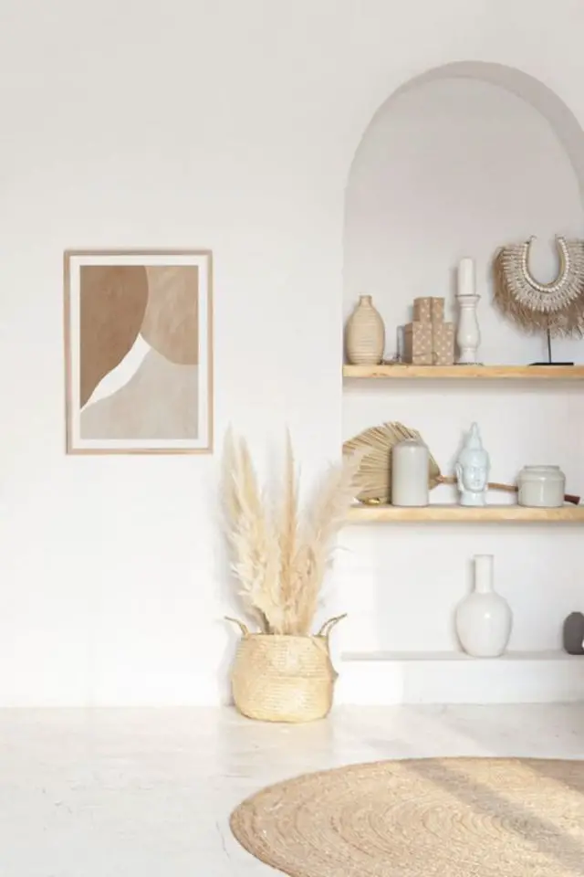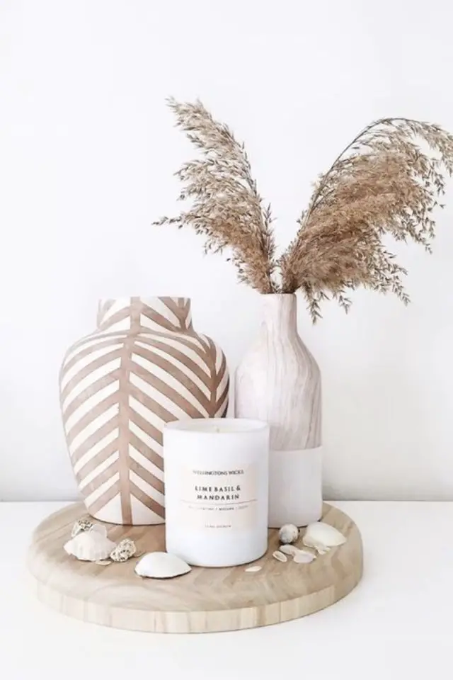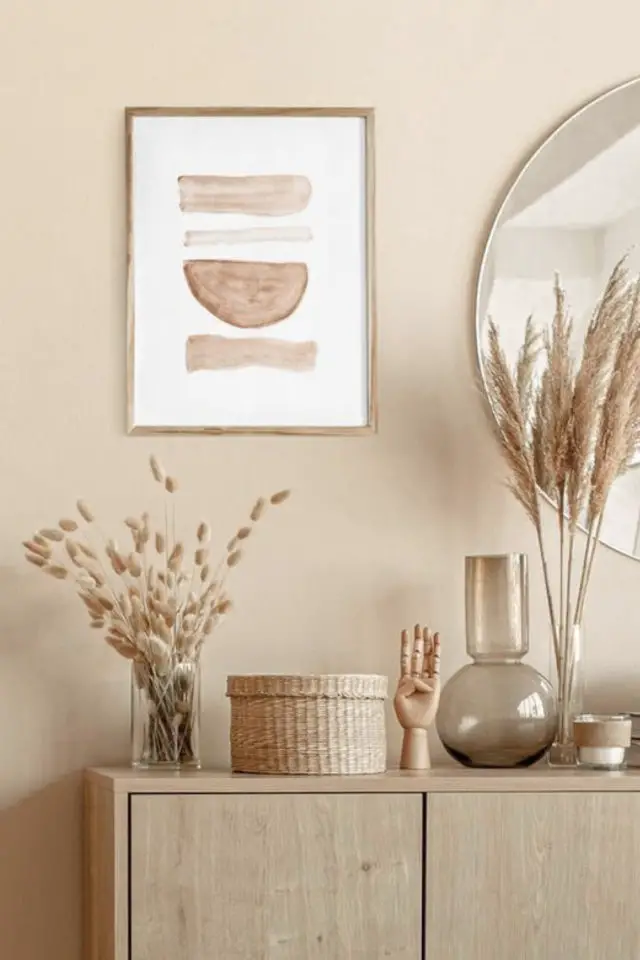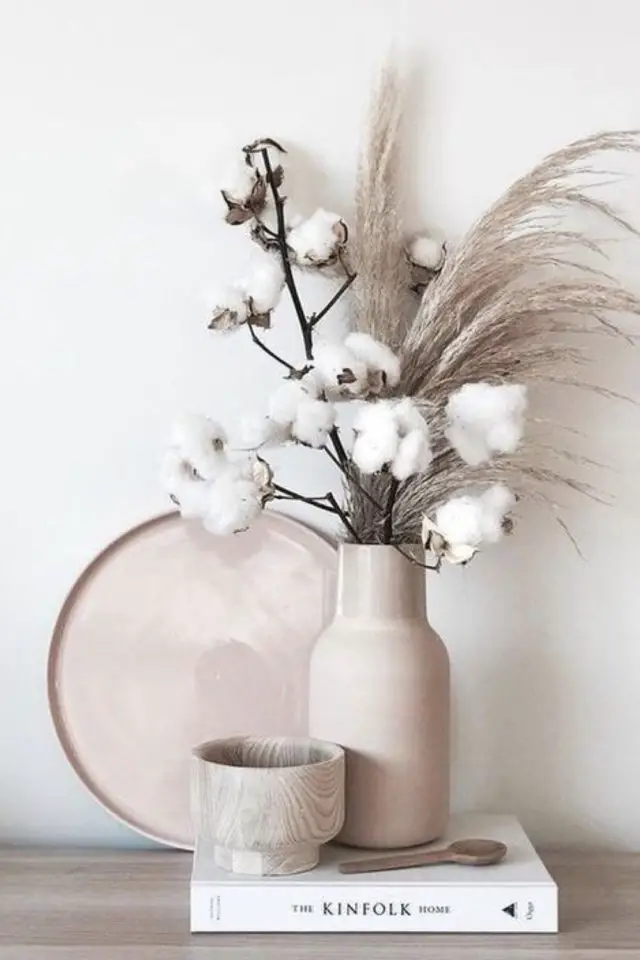 Pour mettre en valeur ces végétaux séchés, il faut évidemment des vases, des jarres, des contenants pour qu'ils tiennent debout! On aura donc des formes douces tout en rondeur, des couleurs neutres et organiques (beige, sable, terracotta...), des matériaux naturels (de la terre cuite, de la céramique, du bois, du verre...) Notez qu'on les trouve rarement tout seul posé au milieu du buffet ou d'une étagère. Il y a souvent un bougie, un plateau, un miroir à proximité. (Encore une fois, on tend vers la question d'équilibre et d'harmonie!)