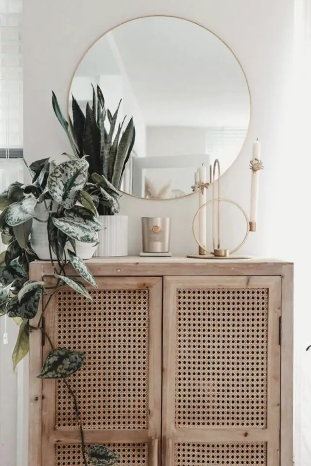 Si votre meuble est collé contre un mur, ce dernier peut aussi être le support d'une partie de votre décoration. On peut y trouver des affiches encadrées (j'y reviens plus bas) ou encore le fameux miroir rond si tendance ces dernières années. Cette décoration murale va vous permettre de créer de la profondeur et travailler la verticalité de votre décor. Le camaïeu de couleurs peut sembler facile à travailler mais faites attention à l'uniformité qui peut être fade.