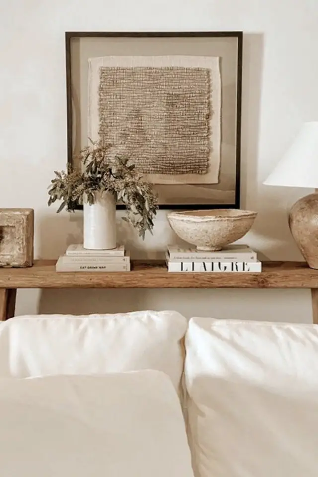 L'un des endroits le plus facile à décorer (que ce soit dans une déco slow ou pas) c'est le dessus des meubles bas: enfilade, buffet, commode, bout de canapé, console... On évite les gros paquets, on joue avec les différents matériaux, volumes et hauteurs. Ce jeu va donner de la vie à votre décor et vous éviter de créer une composition d'objets sans vie et raplapla.