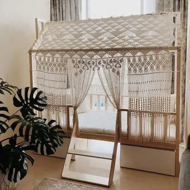 Le 2ème DIY pour relooker le lit de votre chère tête blonde est assez bohème et pleine de douceur. Il est question de faire appel au macramé pour créer des tentures qui viendront recouvrir la partie haute du lit. Le macramé, on le connait bien dans la déco puisque depuis quelques années, il est revenu en force dans nos intérieurs. Chez "les grands", le macramé c'est de la décoration murale sous forme de tentures, des suspension pour les plantes et même des housses de coussin. Chez les petits, le macramé s'invite dans la chambre pour créer une ambiance roulote / bohème. Ce DIY prend un peu plus de temps à réaliser que d'autres présentés dans cet article mais le résultat sera bluffant et unique!