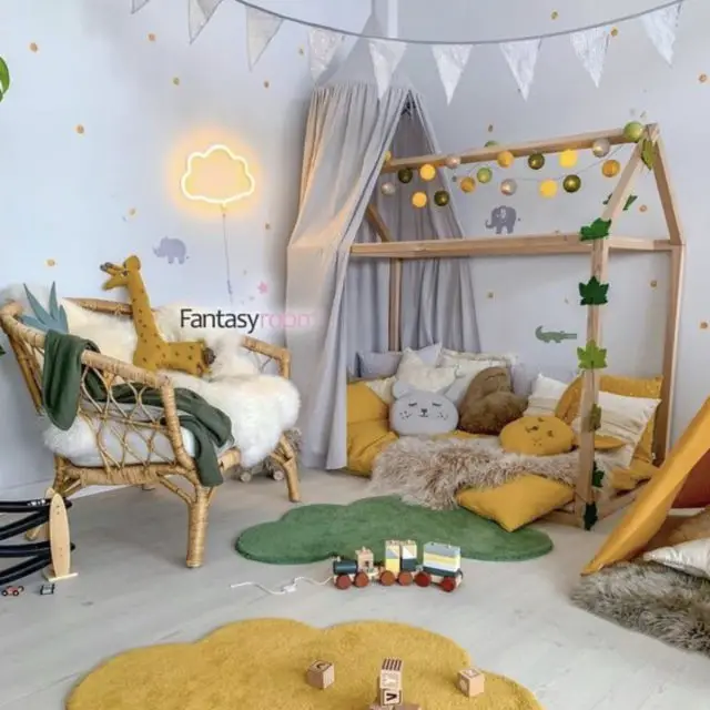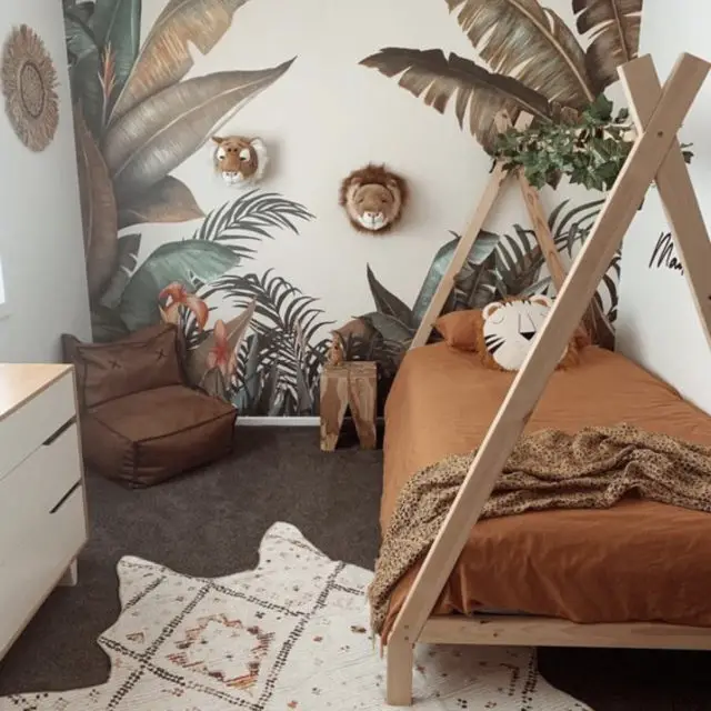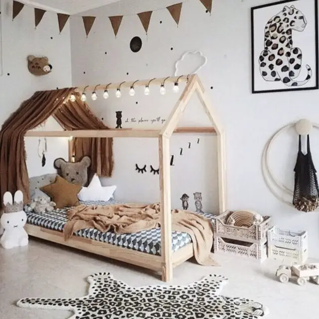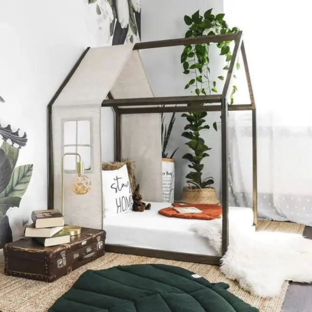 Si la chambre de votre enfant est décorée dans un style jungle, safari ou encore nature, pour parfaire le décor pourquoi ne pas vous servir du lit et de sa structure!? Elle peut être le support pour une guirlande de plantes. Une touche végétale qui renforcera le style de la chambre.