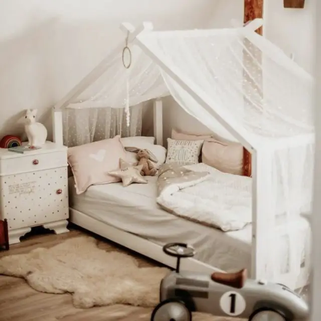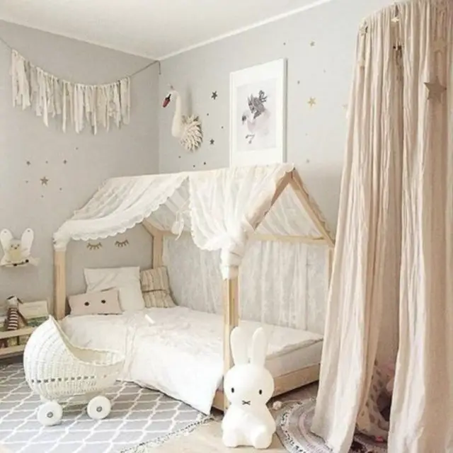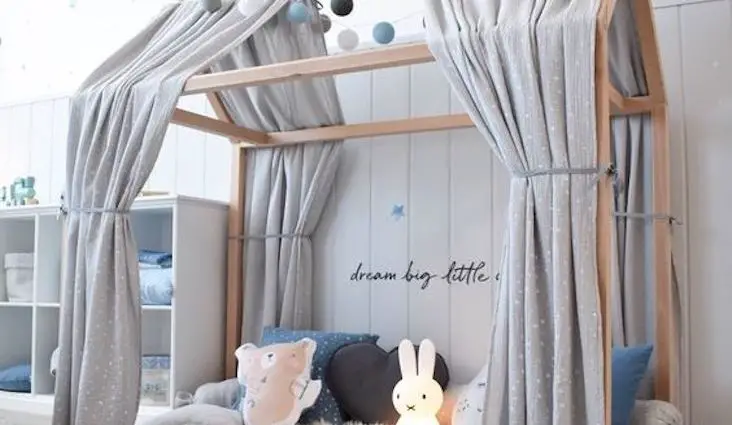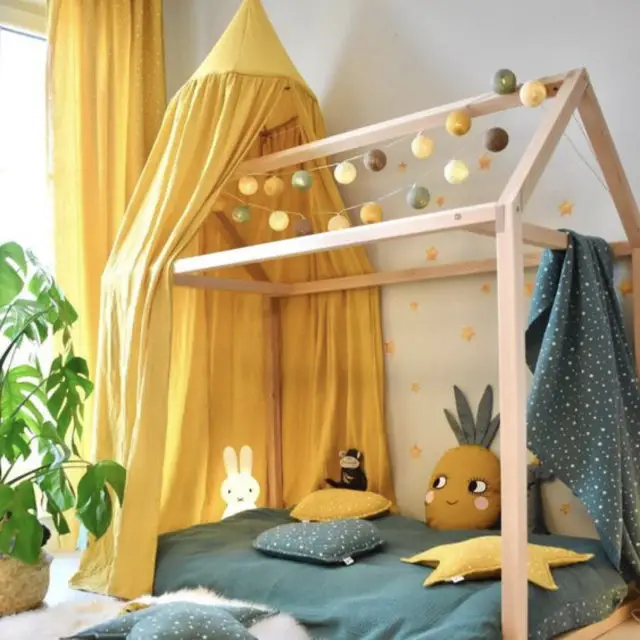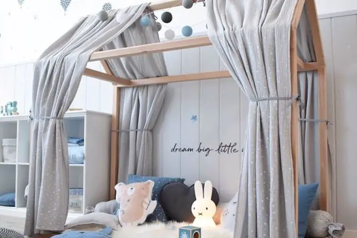 Le ciel de lit est tout à fait tendance actuellement dans la chambre d'enfant et il peut trouver sa place aussi au dessus d'un lit cabane. Il vient recouvrir la tête de lit pour créer une nouvelle fois une sorte de cocon rassurant. Si l'idée vous intéresse, j'ai déjà consacré un article à propos des ciels de lit, vous y trouverez de nombreuses couleurs pour trouver le modèle parfait qui correspondra à l'ambiance de chambre de votre enfant.