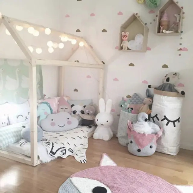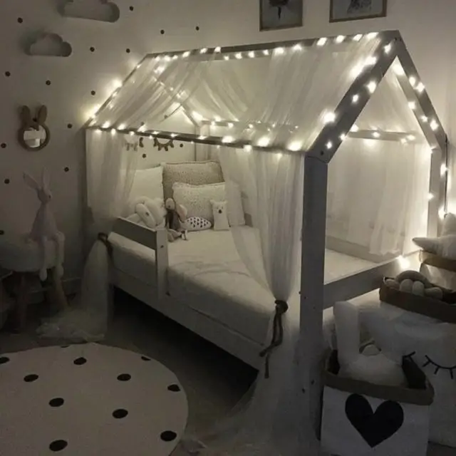 Plus facile et bien plus rapide à mettre en oeuvre: décorer la structure de la maisonnette surplombant le lit avec des guirlandes lumineuses. Vous en avez peut-être déjà chez vous dans un placard d'ailleurs. Ce que je trouve intéressant c'est que cette déco est à la fois très poétique (allumées, les ampoules de la guirlandes donnent l'impression d'être des étoiles) et pratique si votre enfant a peur du noir. Au lieu de la classique veilleuse, la guirlande prend le relais.