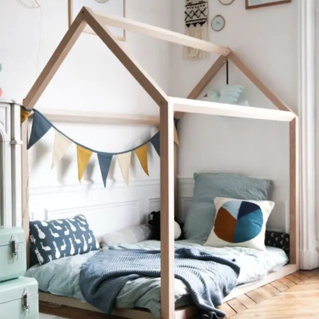 Dernière idée de cet article consacré à la personnalisation d'un lit cabane: les fanions. Ce n'est pas une idée nouvelle mais elle est intemporelle. Le fanion a toujours sa place dans la chambre de votre enfant. Il est jovial, synonyme de fête. Il se décline dans toutes les couleurs possibles et imaginables. Si vous avez quelques notions de couture, il sera rapide de le confectionner vous-même avec les tissus de votre choix. Les fanions peuvent être harmonisés avec le papier-peint de la chambre ou encore avec la parure de lit. C'est un petit détail qui donnera un nouveau souffle à un lit un peu trop classique.
