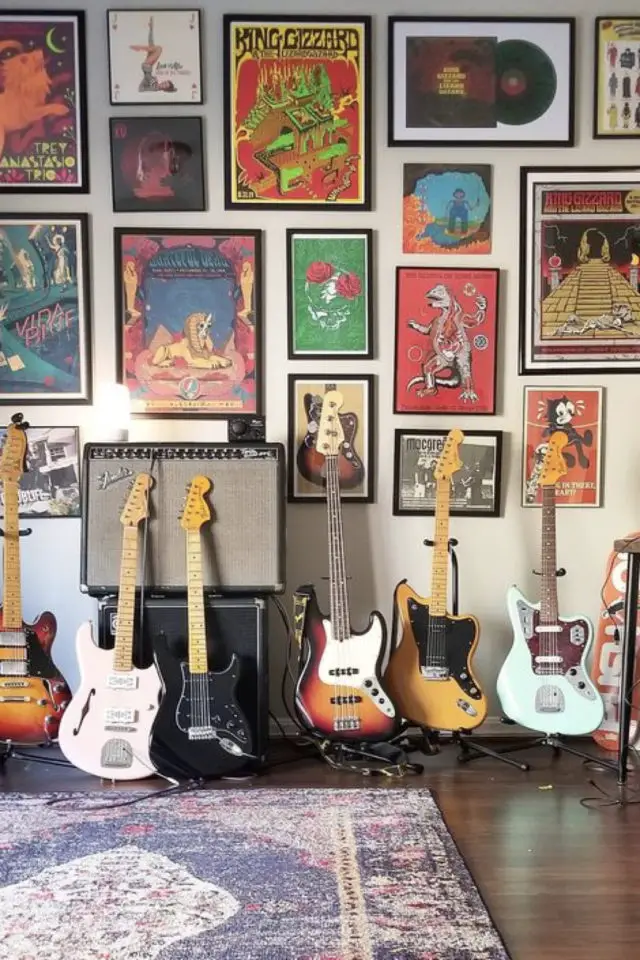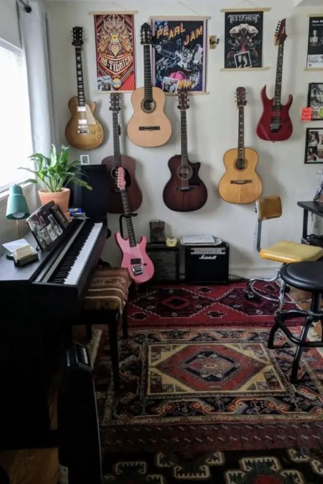 Vu qu'on parle de genre musical traduit en décoration, on s'attend assez à trouver des instruments. Je l'avais déjà écrit dans l'article dédié, si vous n'êtes pas musicien (comme moi), il n'y a peut-être pas d'intérêt à avoir des instruments chez vous. Enfin bref! On va donc trouver guitares, basses, pianos assez facilement dans les intérieurs d'inspiration rock. Mais bon si votre passion le dimanche matin c'est de reprendre les plus grands titres de Black Sabbath à l'accordéon, ce dernier a toute sa place dans votre déco!
