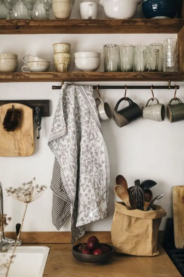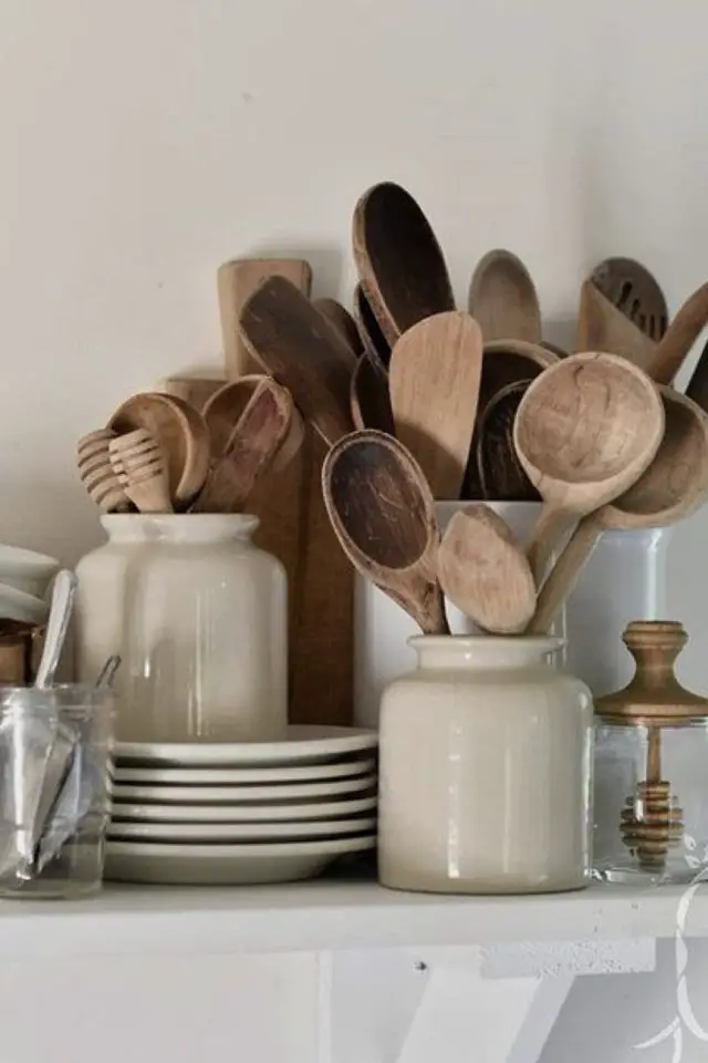 Il y a des ambiances comme celle-ci qui me plaisent beaucoup mais que j'aurais du mal à avoir chez moi. On peut bien apprécier quelque chose sans pour autant s'imaginer vivre dedans au quotidien. C'est un doux mélange d'ambiance farmhouse, de kinfolk avec une pointe de slow par moment. J'aime ce camaïeux de couleurs douces et naturelles. J'aime l'idée de récup', d'objets qui ont vécu. C'est génial pour donner du cachet à la cuisine. On retrouve des étagères en bois, des brosses pour laver la vaisselle, des cuillères en bois plus durables et plus naturelles que du plastique. Il y a aussi de jolis pots en grès émaillés. Tout ceci crée une ambiance charmante, familiale, douce.