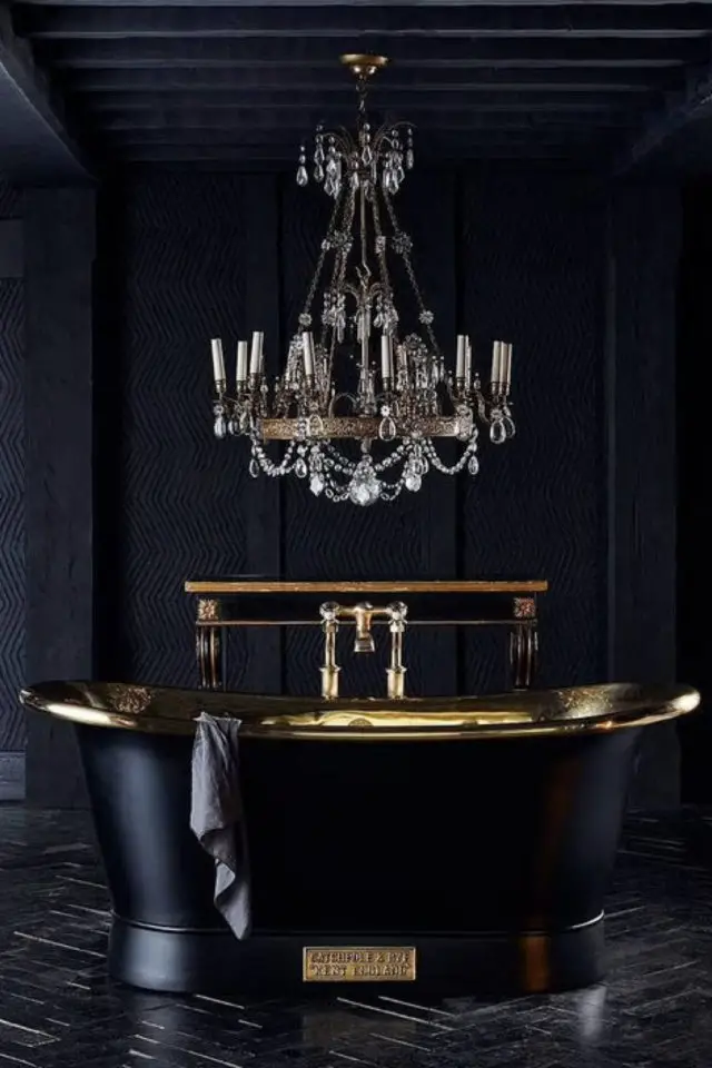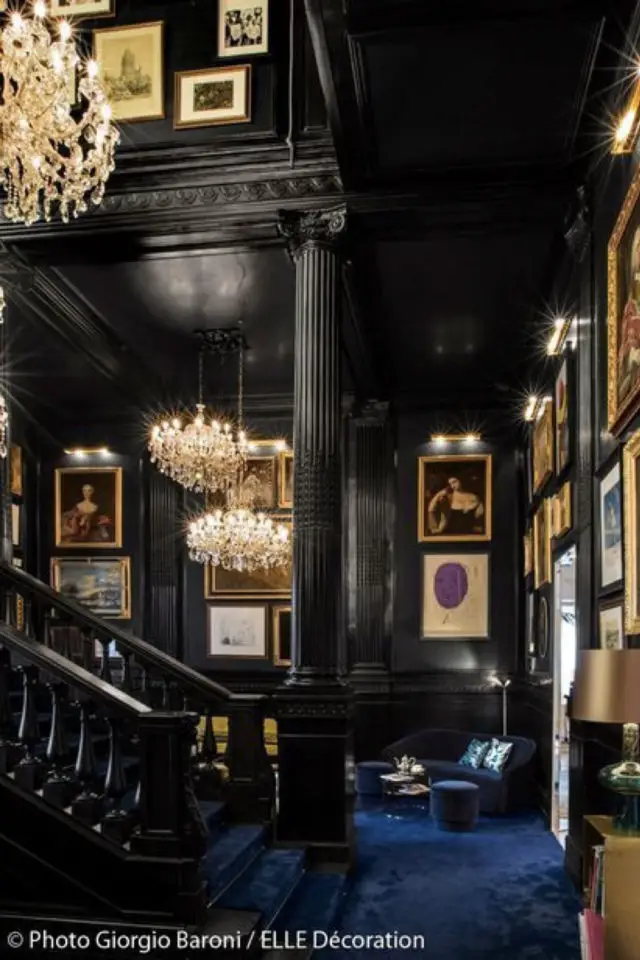 La première chose évidente dans ce style c'est l'omniprésence du noir. Comme je l'écrivais précédemment, le noir est souvent considéré comme une couleur élégante et chic. On va mettre du noir partout en très grande quantité. J'avoue, je ne suis pas une grande fan. J'aime les intérieurs lumineux et blancs. Du coup, je n'arrive pas du tout à m'imaginer dans une pièce toute noire qui me semblera lugubre. Comme pour les intérieurs peints en couleurs sombres, c'est tout un art de créer une ambiance qui semble lumineuse en utilisant en grande partie du noir. On va pouvoir compter sur des matières plus brillantes comme le velours ou le cuir par exemple pour donner un peu d'éclat à cet ensemble sombre.