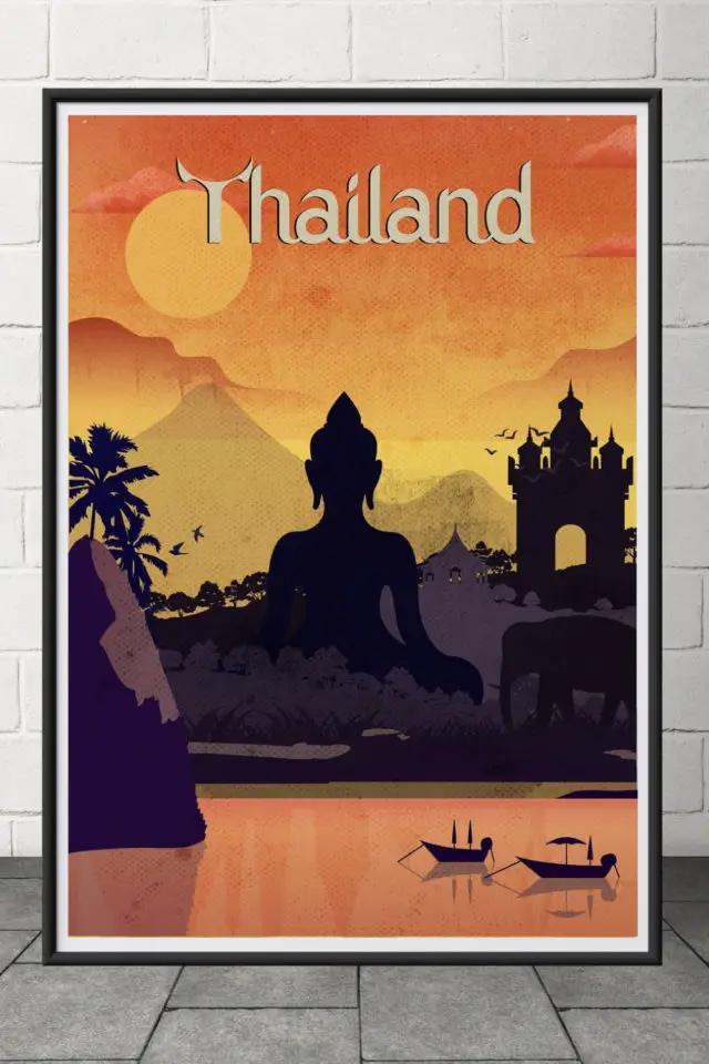 La Thaïlande est un pays qui fait rêver beaucoup de monde. Et je le comprends! Au sud, il y a une myriade d'îles aux décors paradisiaques, au nord c'est la jungle et les temples bouddhistes. On a eu la chance de vivre un bout de temps (plus d'un an au final) dans ce merveilleux pays. J'ai hâte que le Covid soit derrière nous pour pouvoir y retourner librement. C'est un pays que l'on affectionne tout particulièrement. La gentillesse des gens, la nourriture délicieuse, le climat parfait pour moi même pendant la mousson... Il y a tant de choses que l'on aime dans ce pays. Faute de pouvoir y voyager facilement en ce moment, je vous propose une sélection d'affiches pour décorer votre intérieur et voyager là-bas sans bouger de chez vous. J'espère que cette sélection vous plaira!