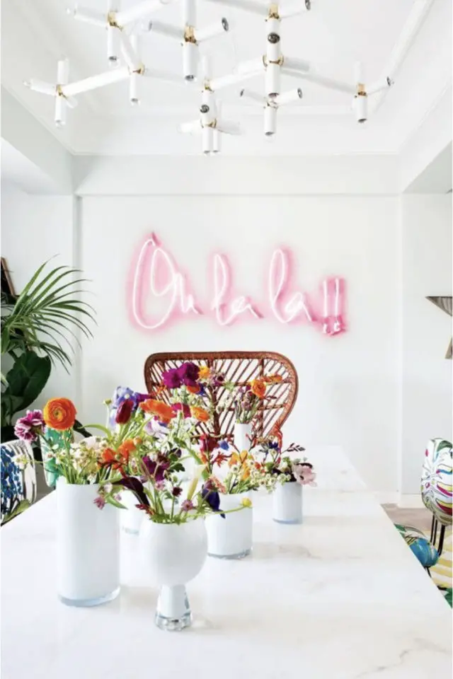 - Le néon est aussi une référence à une époque révolue - pas exclusivement les années 90. (Je viens de voir que le film Flashdance datait de l'année bénie des dieux 1983). Et le néon en déco peut vous permettre de 1/ décorer vos murs 2/ créer une ambiance lumineuse un peu hors du temps.