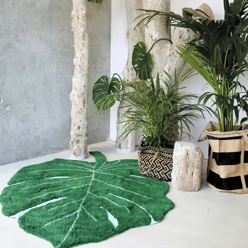17 • La peinture n'est pas la seule solution pour apporter de la couleur dans une pièce. Le papier peint peut aussi jouer ce rôle. Ici c'est un papier peint imprimé de motifs tropicaux. Néanmoins, c'est un papier très chargé. Il n'est pas que vert. On y trouve aussi de l'orange, du jaune. Et cela peut être une très bonne alternative si vous souhaitez créer une ambiance nature sans mettre trop de plantes. Ce papier peint est équilibré par l'utilisation de matériaux naturels comme le rotin, la toile de jute.