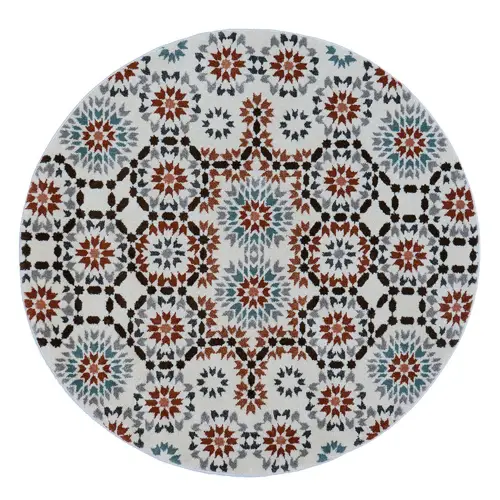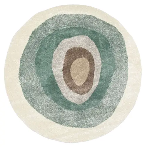 05 • Jusqu'à présent, je vous ai essentiellement proposé des décors de salons unis. Ce n'est pas la seule possibilité pour créer un salon hyper coloré. On verra un peu plus bas quelques exemples avec du papier peint. Ici, c'est de la peinture. Un décor mural très moderne composé de formes géométriques simples et colorées. Du rose, du vert, du jaune... le tout sur fond bleu. On retrouve à peu près le même esprit sur le tapis. Les meubles en bois, la banquette grise apportent un équilibre.
