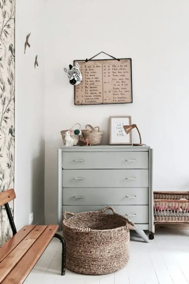 Passons maintenant à un univers plus doux. J'aime le vert passionnément. J'aime aussi le vert sauge qui est un doux mélange entre le gris et le vert. C'est une couleur qui semble être enveloppante. Et c'est généralement un sentiment que l'on recherche dans la chambre d'enfant. Le vert sauge se retrouve sur le mobilier (lit, armoire, commode) mais aussi sur les murs ou encore sur le plafond pour les plus audacieux! Il y a un côté nature aussi avec cette couleur qui me plait beaucoup.