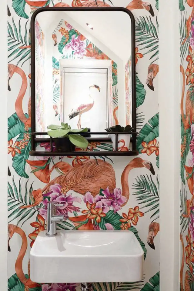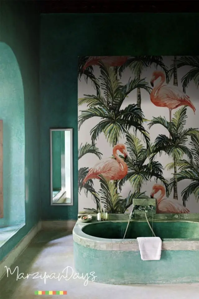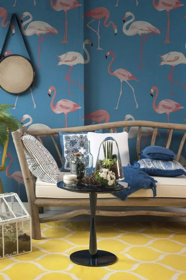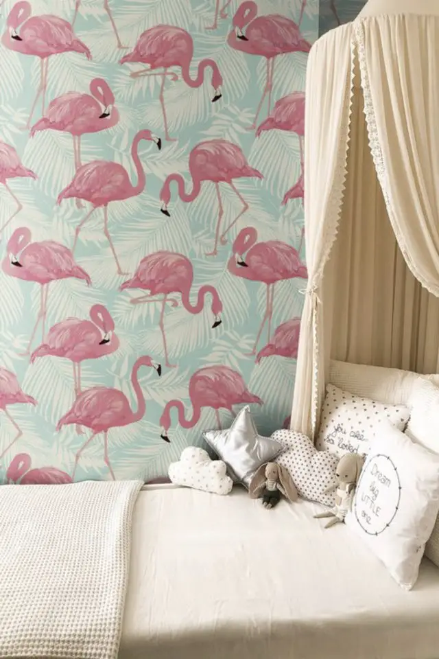 Pour commencer cet article et cette semaine, j'avais besoin de quelque chose d'un peu fun. Vu l'actualité merdique, ça ne peut pas faire de mal de penser à autre chose et de chercher un peu d'originalité. Et je me suis dit, pourquoi pas les flamants roses? Il n'y a rien de nouveau dans ce motif mais je trouve qu'il a toujours quelque chose d'étonnant. On ne s'y attend pas et ce n'est pas si commun. Le flamant (avec un t et pas un d) apporte une touche de rose aussi dans votre pièce sans pour autant faire too much. Il se marie très bien avec du vert pour une ambiance tropicale, avec du blanc pour pour d'équilibre ou encore avec du bleu pour un effet un peu rétro. De la chambre à la salle de bain, en passant par le salon, le papier peint flamant rose mettra de la bonne humeur dans votre déco!