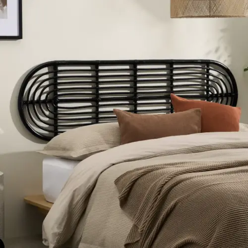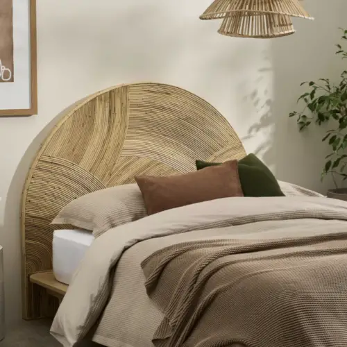 01 • Une tête de lit arrondie en cannage contre un mur de couleur sourde.